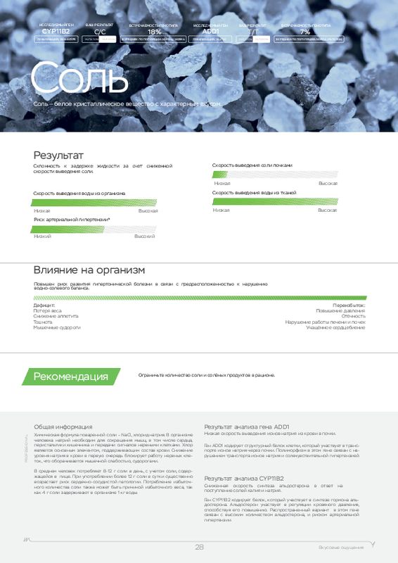 Этот ДНК анализ показывает, к каким физическим нагрузкам человек расположен генетически, а также какие продукты (содержащие определенные элементы) лучше употреблять в пищу. У каждого человека свои цели, кто-то хочет просто сбросить лишний вес, кто-то увеличить силу мышц, а кто-то нарастить огромные мускулы. Для получения максимальной отдачи от тренировок мы рекомендуем пройти наш генетический тест для фитнеса в Артёмовском.